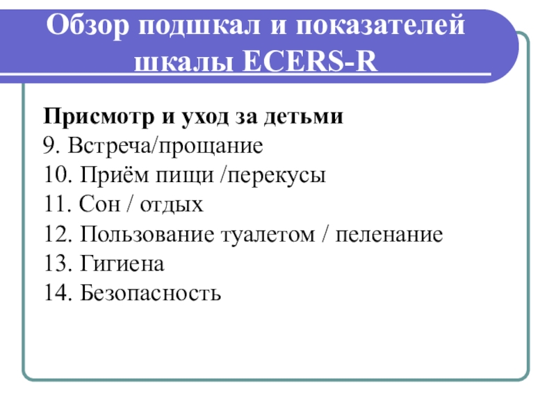 Слайд 9Обзор подшкал и показателей шкалы ECERS-R