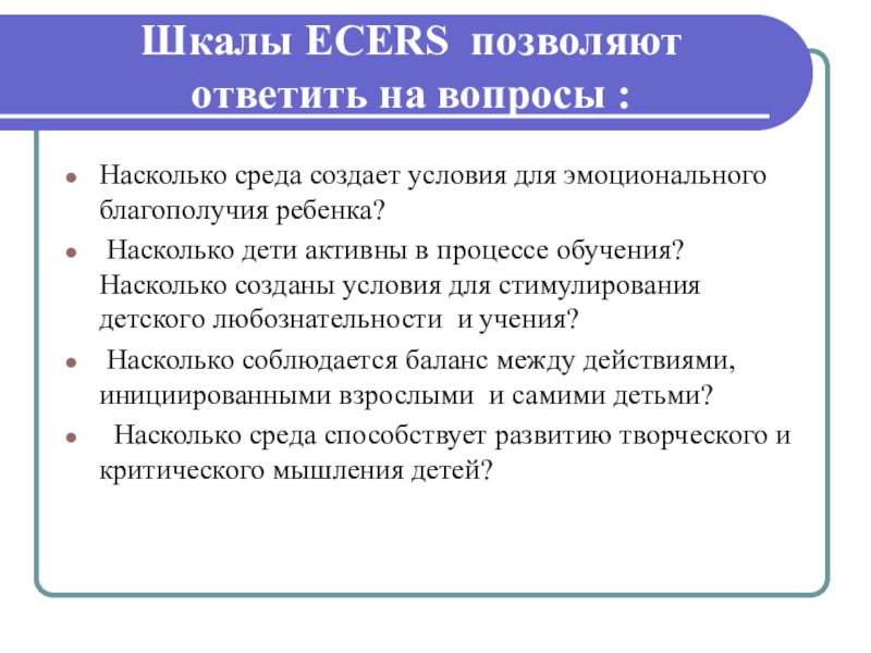 Слайд 4Шкалы ECERS позволяют ответить на вопросы :