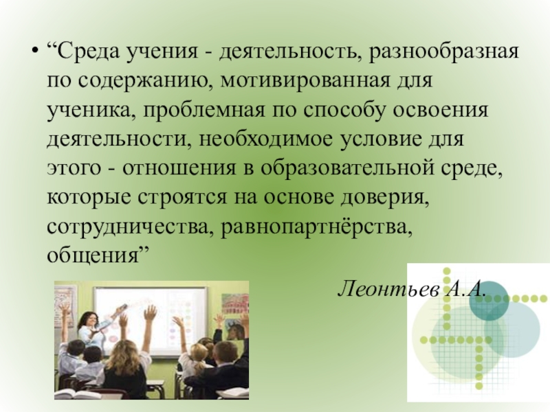 “Среда учения - деятельность, разнообразная по содержанию, мотивированная для ученика, проблемная