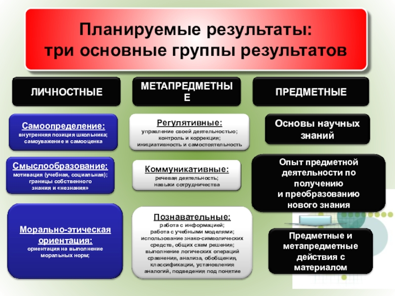 Принципиальным отличием современного подхода является ориентация стандартов на результаты освоения основных образовательных программ. Под результатами понимается не только предметные знания, но и умение применять эти знания в практической деятельности.