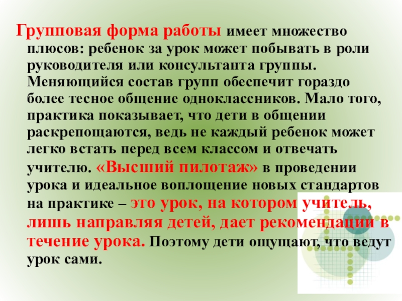 может побывать в роли руководителя или консультанта группы. Меняющийся состав групп обеспечит гораздо более тесное общение одноклассников. Мало того, практика показывает, что дети в общении раскрепощаются, ведь не каждый ребенок может легко встать перед всем классом и отвечать учителю. «Высший пилотаж» в проведении урока и идеальное воплощение новых стандартов на практике – это урок, на котором учитель, лишь направляя детей, дает рекомендации в течение урока. Поэтому дети ощущают, что ведут урок сами.