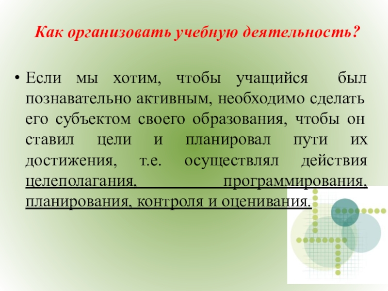 необходимо сделать его субъектом своего образования, чтобы он ставил цели и планировал пути их достижения, т.е. осуществлял действия целеполагания, программирования, планирования, контроля и оценивания.