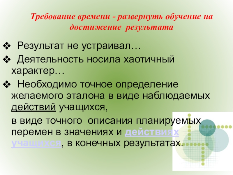 Слайд 16Требование времени - развернуть обучение на достижение результата