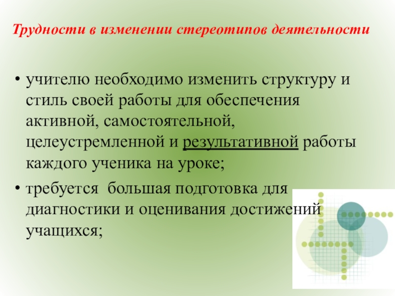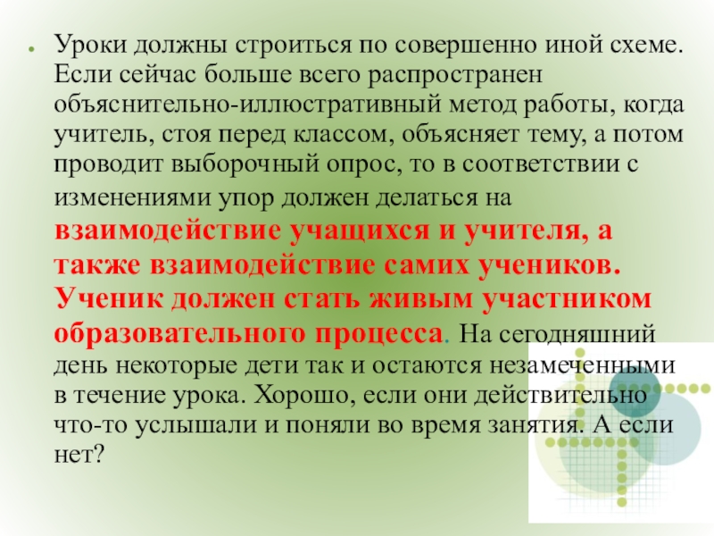 распространен объяснительно-иллюстративный метод работы, когда учитель, стоя перед классом, объясняет тему, а потом проводит выборочный опрос, то в соответствии с изменениями упор должен делаться на взаимодействие учащихся и учителя, а также взаимодействие самих учеников. Ученик должен стать живым участником образовательного процесса. На сегодняшний день некоторые дети так и остаются незамеченными в течение урока. Хорошо, если они действительно что-то услышали и поняли во время занятия. А если нет?