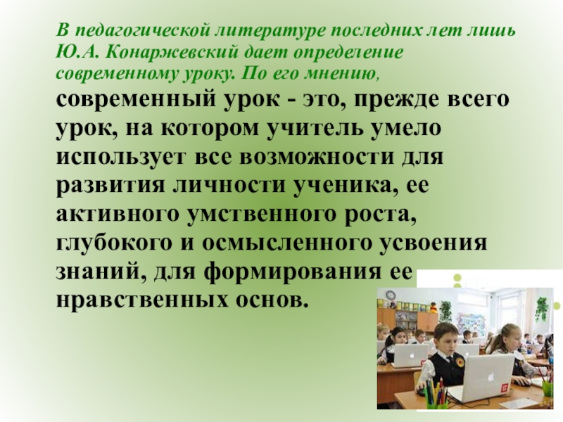 дает определение современному уроку. По его мнению, современный урок - это, прежде всего урок, на котором учитель умело использует все возможности для развития личности ученика, ее активного умственного роста, глубокого и осмысленного усвоения знаний, для формирования ее нравственных основ.