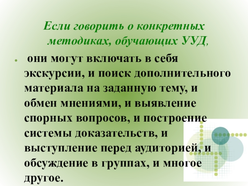 себя экскурсии, и поиск дополнительного материала на заданную тему, и обмен мнениями, и выявление спорных вопросов, и построение системы доказательств, и выступление перед аудиторией, и обсуждение в группах, и многое другое.