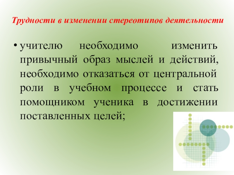 действий, необходимо отказаться от центральной роли в учебном процессе и стать помощником ученика в достижении поставленных целей;