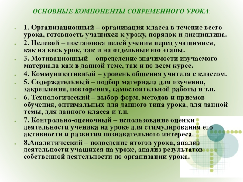 ОСНОВНЫЕ КОМПОНЕНТЫ СОВРЕМЕННОГО УРОКА: