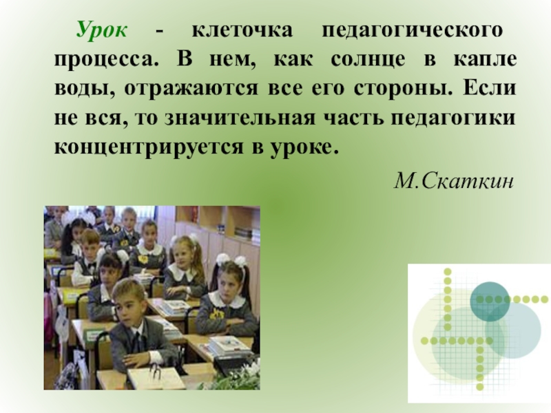 капле воды, отражаются все его стороны. Если не вся, то значительная часть педагогики концентрируется в уроке.