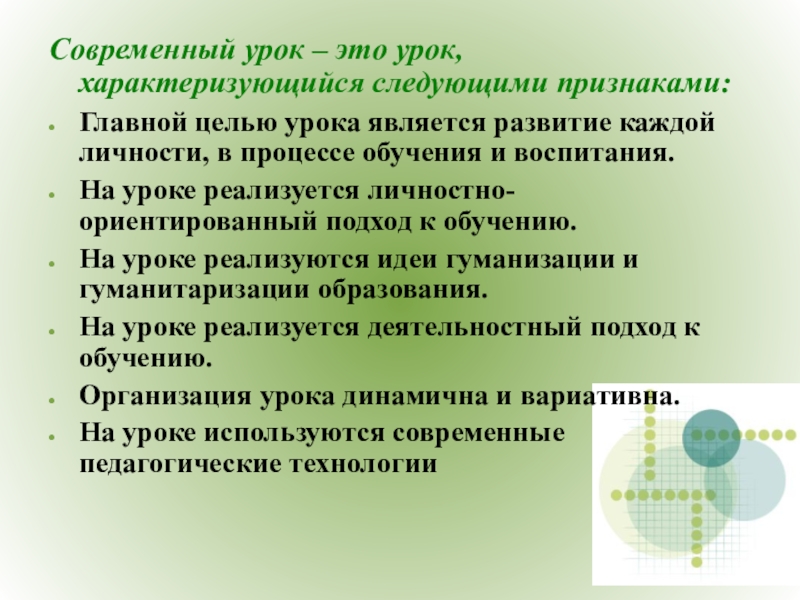 Слайд 7Современный урок – это урок, характеризующийся следующими признаками: