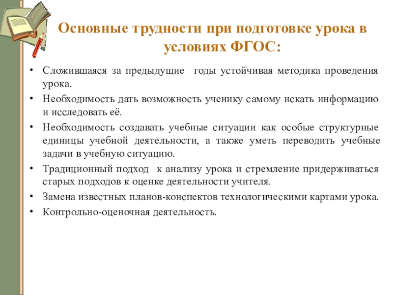 Слайд 8Основные трудности при подготовке урока в условиях ФГОС: