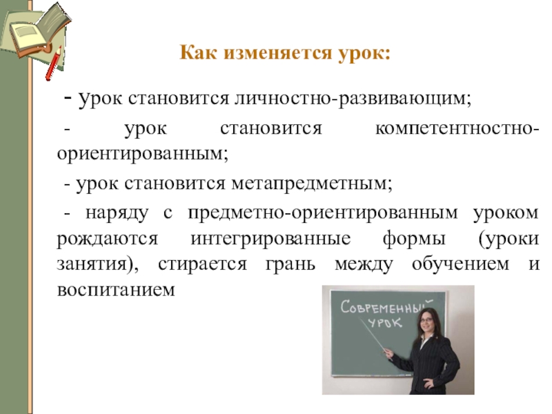 Как изменяется урок:	- урок становится личностно-развивающим;	- урок становится компетентностно-ориентированным;	- урок становится метапредметным;	- наряду с предметно-ориентированным уроком рождаются
