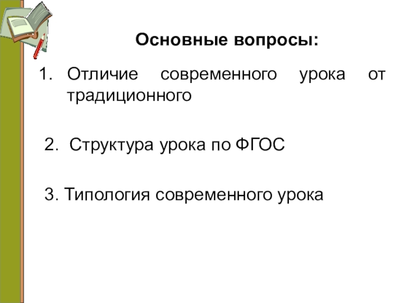 Основные вопросы:Отличие современного урока от традиционного2. Структура урока по ФГОС3. Типология современного урока