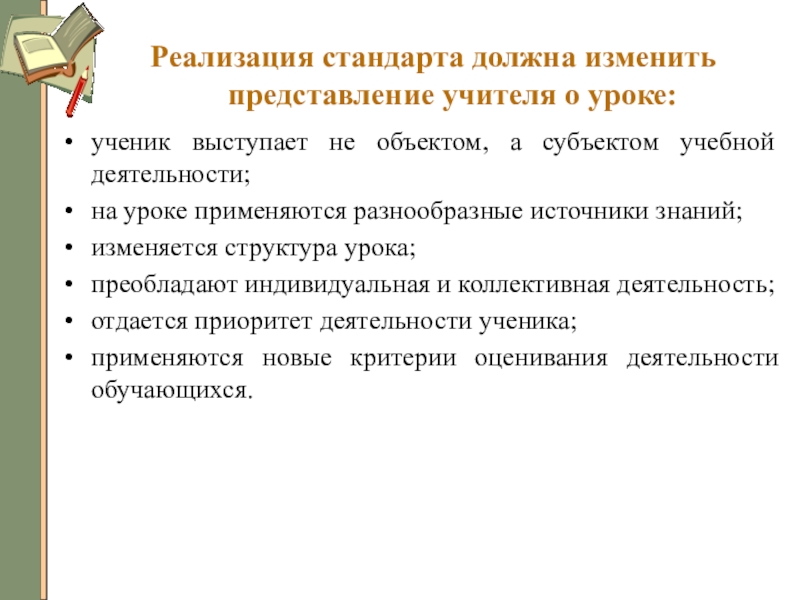 Слайд 9Реализация стандарта должна изменить представление учителя о уроке: