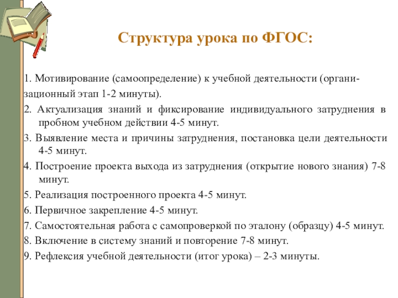 Структура урока по ФГОС:1. Мотивирование (самоопределение) к учебной деятельности (органи-зационный этап 1-2 минуты).2. Актуализация знаний и фиксирование