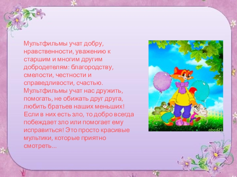 Слайд 27Мультфильмы учат добру, нравственности, уважению к старшим и многим другим добродетелям: