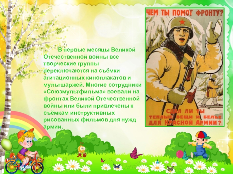 Отечественной войны все творческие группы переключаются на съёмки агитационных киноплакатов и мультшаржей. Многие сотрудники «Союзмультфильма» воевали на фронтах Великой Отечественной войны или были привлечены к съёмкам инструктивных рисованных фильмов для нужд армии.