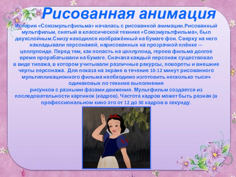 История «Союзмультфильма» началась с рисованной анимации.Рисованный мультфильм, снятый в классической технике «Союзмультфильма», был двухслойным.Снизу находился изображённый на бумаге фон. Сверху на него накладывали персонажей, нарисованных на прозрачной плёнке — целлулоиде. Перед тем, как попасть на целлулоид, героев фильма долгое время прорабатывали на бумаге. Сначала каждый персонаж существовал в виде типажа, в котором учитывали различные ракурсы, повороты и внешние черты персонажа. Для показа на экране в течение 10-12 минут рисованного мультипликационного фильма необходимо изготовить несколько тысяч одинаковых по технике выполнения рисунков с разными фазами движения. Мультфильм создается из последовательности картинок (кадров). Частота кадров может быть разная (в профессиональном кино это от 12 до 30 кадров в секунду.