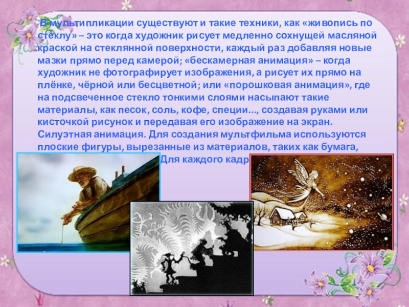 В мультипликации существуют и такие техники, как «живопись по стеклу» – это когда художник рисует медленно сохнущей масляной краской на стеклянной поверхности, каждый раз добавляя новые мазки прямо перед камерой; «бескамерная анимация» – когда художник не фотографирует изображения, а рисует их прямо на плёнке, чёрной или бесцветной; или «порошковая анимация», где на подсвеченное стекло тонкими слоями насыпают такие материалы, как песок, соль, кофе, специи..., создавая руками или кисточкой рисунок и передавая его изображение на экран. Силуэтная анимация. Для создания мультфильма используются плоские фигуры, вырезанные из материалов, таких как бумага, плотная ткань и другие. Для каждого кадра фигуры передвигаются и снимаются на камеру.