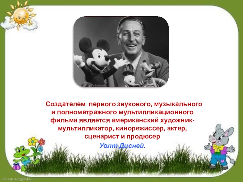 Слайд 5 Создателем первого звукового, музыкального и полнометражного мультипликационного фильма является американский