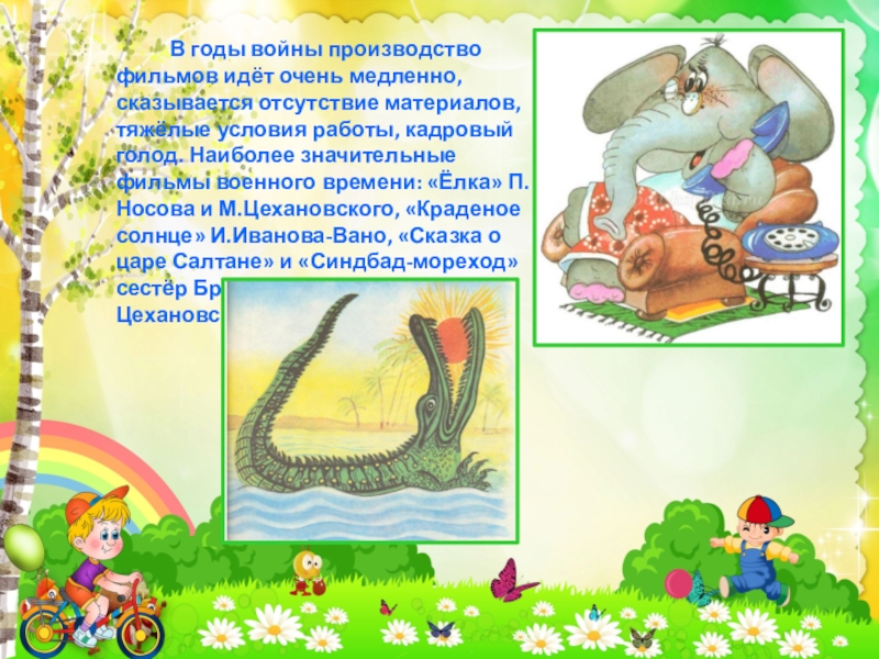 фильмов идёт очень медленно, сказывается отсутствие материалов, тяжёлые условия работы, кадровый голод. Наиболее значительные фильмы военного времени: «Ёлка» П.Носова и М.Цехановского, «Краденое солнце» И.Иванова-Вано, «Сказка о царе Салтане» и «Синдбад-мореход» сестёр Брумберг, «Телефон» М.Цехановского.