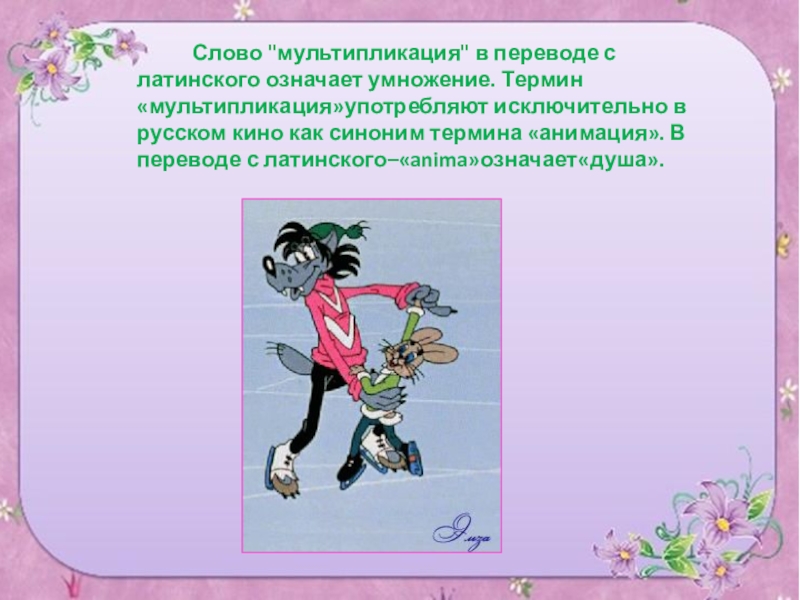 латинского означает умножение. Термин«мультипликация»употребляют исключительно в русском кино как синоним термина «анимация». В переводе с латинского–«anima»означает«душа».