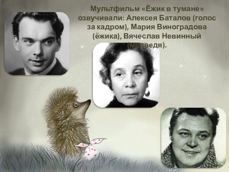 Слайд 16Мультфильм «Ёжик в тумане» озвучивали: Алексея Баталов (голос за кадром), Мария Виноградова