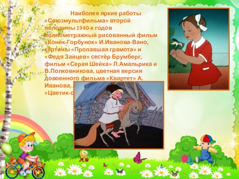 Наиболее яркие работы «Союзмультфильма» второй половины 1940-х годов полнометражный рисованный фильм «Конёк-Горбунок» И.Иванова-Вано, картины «Пропавшая грамота» и «Федя Зайцев» сестёр Брумберг, фильм «Серая Шейка» Л.Амальрика и В.Полковникова, цветная версия довоенного фильма «Квартет» А.Иванова, лента М.Цехановского «Цветик-семицветик».
