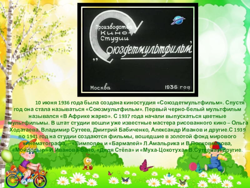 1936 года была создана киностудия «Союздетмультфильм». Спустя год она стала называться «Союзмультфильм». Первый черно-белый мультфильм назывался «В Африке жарко». С 1937 года начали выпускаться цветные мультфильмы. В штат студии вошли уже известные мастера рисованного кино – Ольга Ходатаева, Владимир Сутеев, Дмитрий Бабиченко, Александр Иванов и другие.С 1939 по 1941 год на студии создаются фильмы, вошедшие в золотой фонд мирового кинематографа, – «Лимпопо» и «Бармалей» Л.Амальрика и В.Полковникова, «Мойдодыр» И.Иванова-Вано, «Дядя Стёпа» и «Муха-Цокотуха» В.Сутеева и другие.