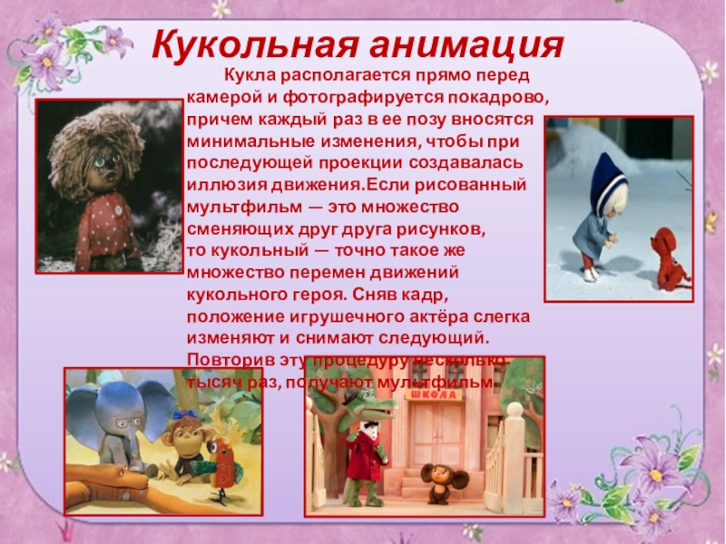 и фотографируется покадрово, причем каждый раз в ее позу вносятся минимальные изменения, чтобы при последующей проекции создавалась иллюзия движения.Если рисованный мультфильм — это множество сменяющих друг друга рисунков, то кукольный — точно такое же множество перемен движений кукольного героя. Сняв кадр, положение игрушечного актёра слегка изменяют и снимают следующий. Повторив эту процедуру несколько тысяч раз, получают мультфильм.