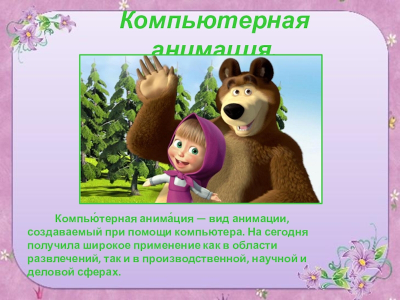анимации, создаваемый при помощи компьютера. На сегодня получила широкое применение как в области развлечений, так и в производственной, научной и деловой сферах.