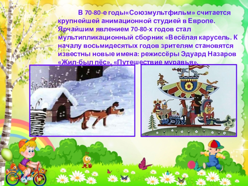 считается крупнейшей анимационной студией в Европе. Ярчайшим явлением 70-80-х годов стал мультипликационный сборник «Весёлая карусель. К началу восьмидесятых годов зрителям становятся известны новые имена: режиссёры Эдуард Назаров «Жил-был пёс», «Путешествие муравья».