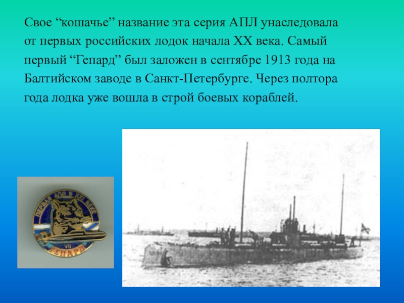 Свое “кошачье” название эта серия АПЛ унаследовалаот первых российских лодок начала XX века. Самый первый “Гепард” был