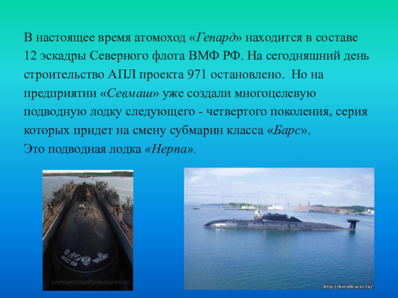 Слайд 10В настоящее время атомоход «Гепард» находится в составе