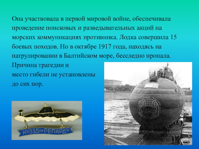Она участвовала в первой мировой войне, обеспечивала проведение поисковых и разведывательных акций на морских коммуникациях противника. Лодка
