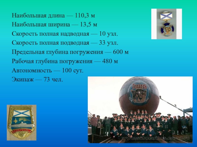Наибольшая длина — 110,3 мНаибольшая ширина — 13,5 мСкорость полная надводная — 10 узл.Скорость полная подводная —