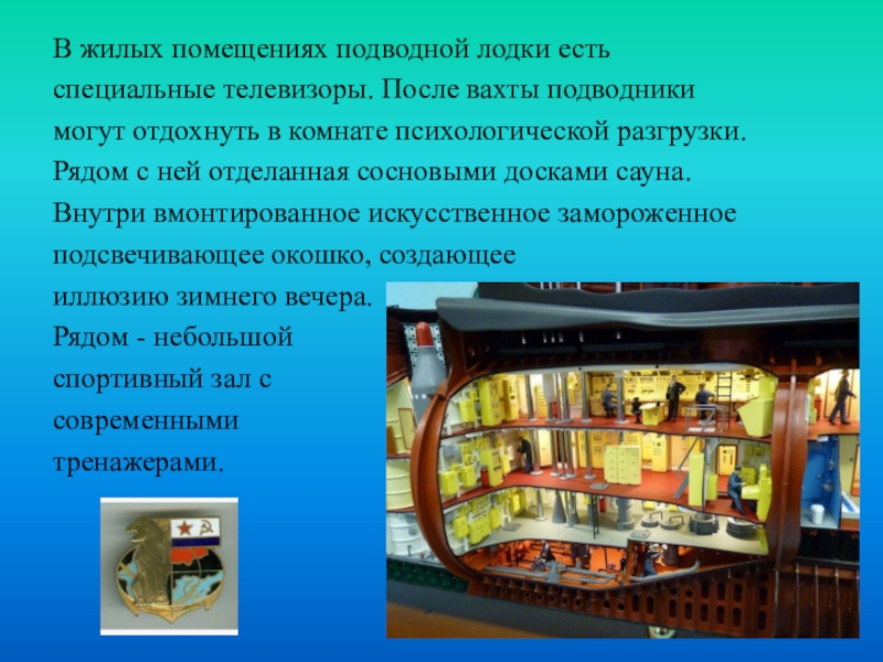 Слайд 8В жилых помещениях подводной лодки есть