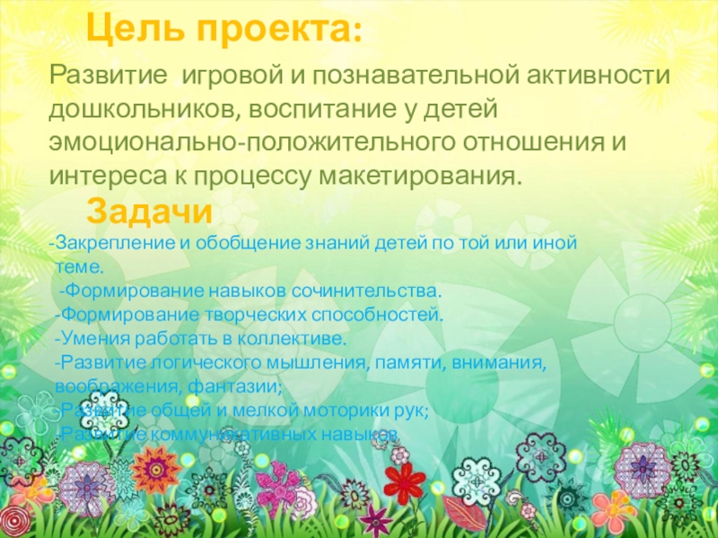 -Формирование навыков сочинительства. -Формирование творческих способностей. -Умения работать в коллективе. -Развитие логического мышления, памяти, внимания, воображения, фантазии; -Развитие общей и мелкой моторики рук; -Развитие коммуникативных навыков