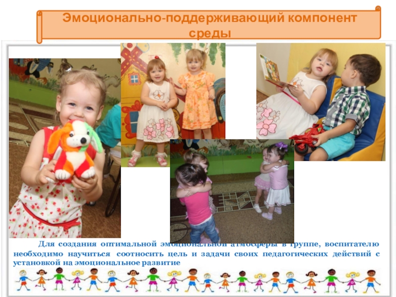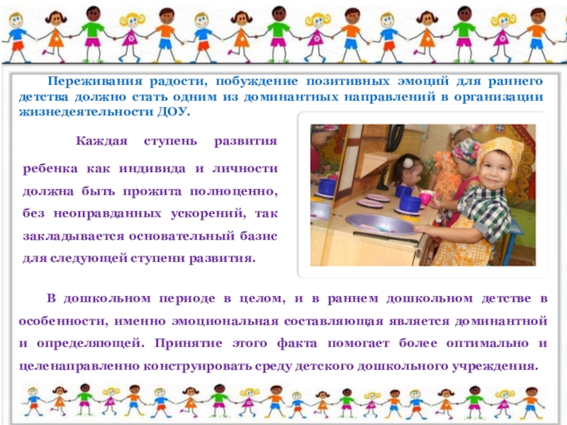 В дошкольном периоде в целом, и в раннем дошкольном детстве в особенности, именно эмоциональная составляющая является доминантной и определяющей. Принятие этого факта помогает более оптимально и целенаправленно конструировать среду детского дошкольного учреждения.