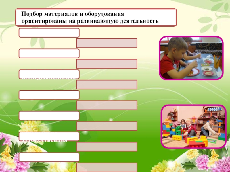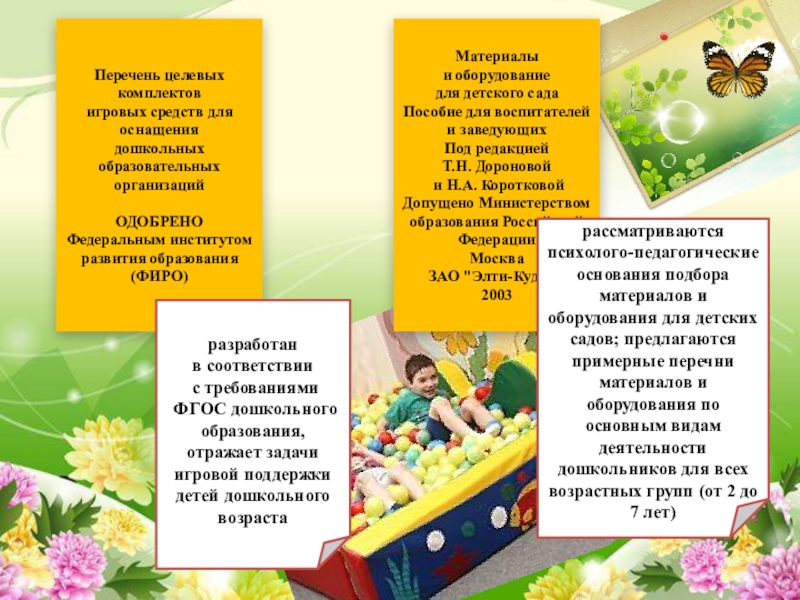 рассматриваются психолого-педагогические основания подбора материалов и оборудования для детских садов; предлагаются примерные перечни материалов и оборудования по основным видам деятельности дошкольников для всех возрастных групп (от 2 до 7 лет)