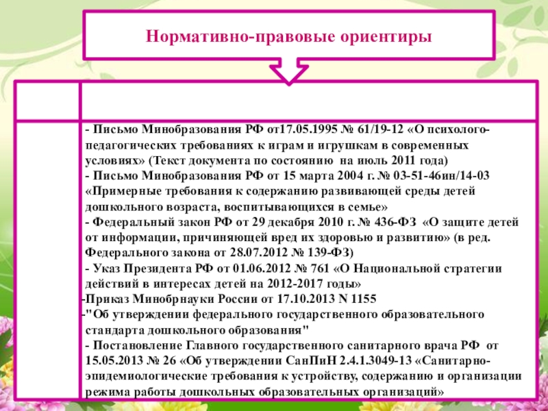 Постановление Главного государственного санитарного врача РФ от 15.05.2013 № 26 «Об утверждении СанПиН 2.4.1.3049-13 «Санитарно-эпидемиологические требования к устройству, содержанию и организации режима работы дошкольных образовательных организаций»