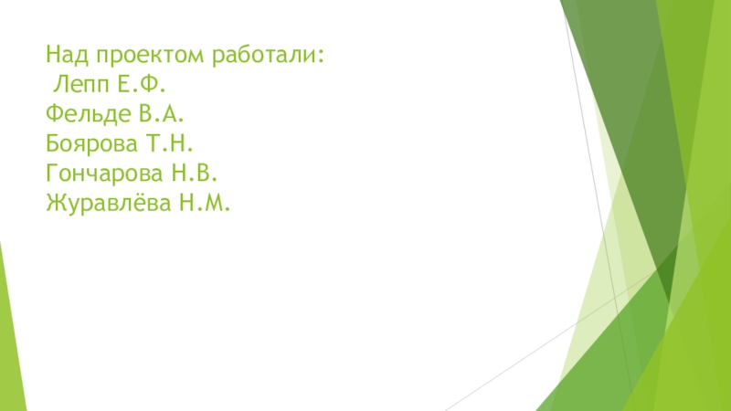 Слайд 8Над проектом работали: Лепп Е.Ф. Фельде В.А. Боярова Т.Н. Гончарова Н.В. Журавлёва Н.М.
