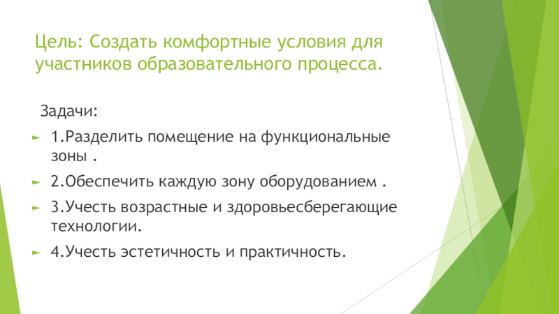 Цель: Создать комфортные условия для участников образовательного процесса. Задачи:1.Разделить помещение на функциональные зоны .2.Обеспечить каждую зону оборудованием .3.Учесть возрастные и здоровьесберегающие технологии.4.Учесть эстетичность и практичность.