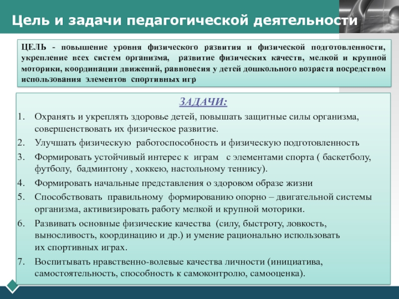 ЦЕЛЬ - повышение уровня физического развития и физической подготовленности, укрепление всех систем организма, развитие физических качеств, мелкой и крупной моторики, координации движений, равновесия у детей дошкольного возраста посредством использования элементов спортивных игр