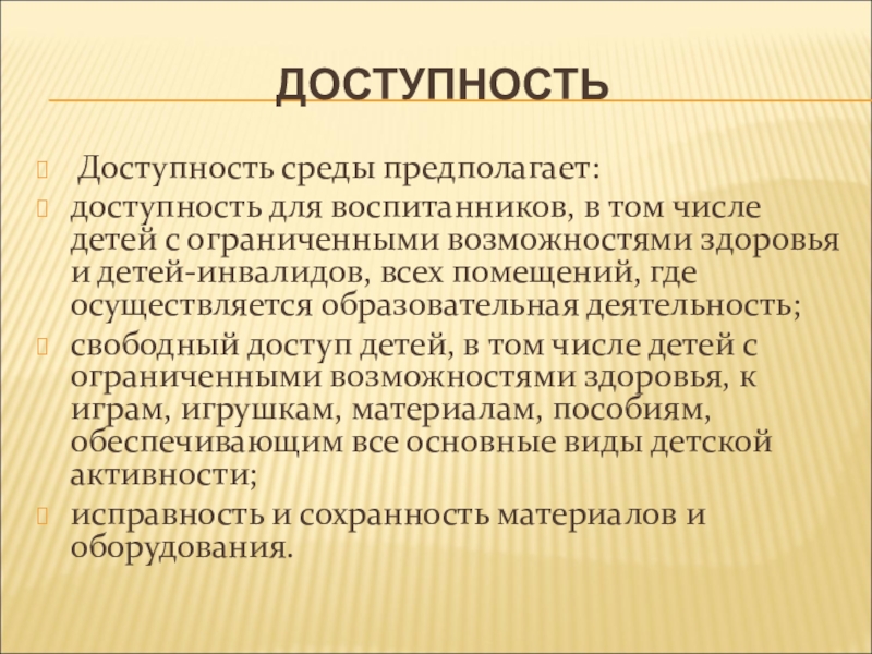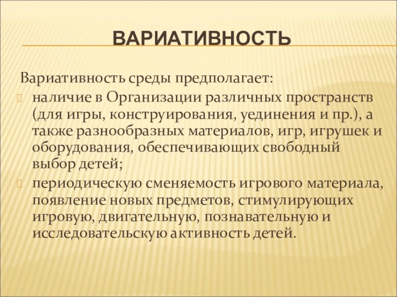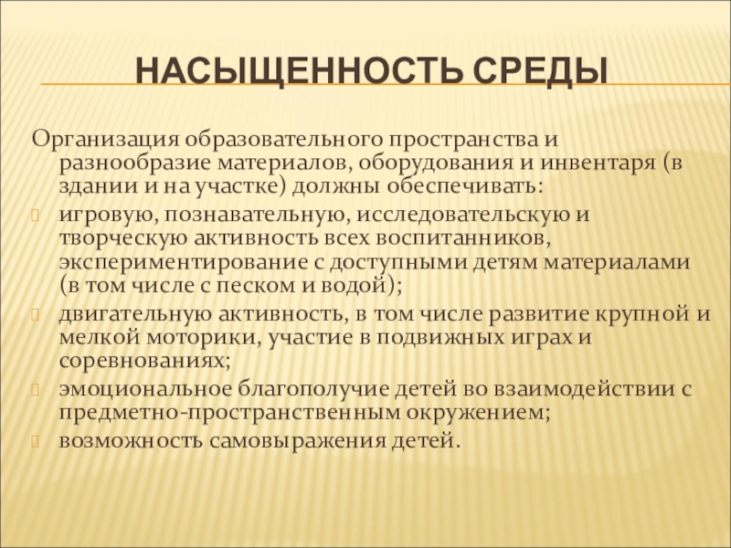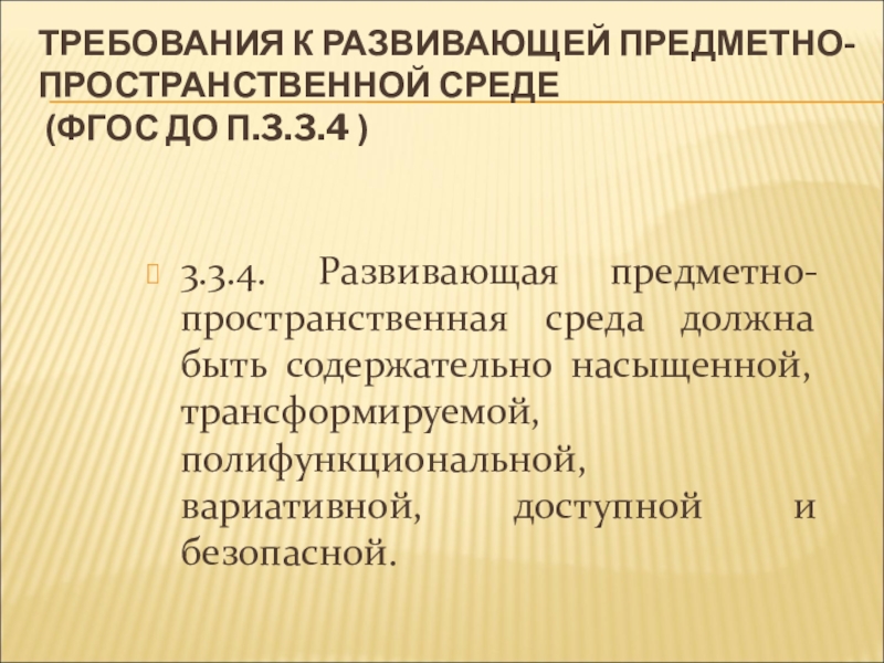 предметно-пространственная среда должна быть содержательно насыщенной, трансформируемой, полифункциональной, вариативной, доступной и безопасной.