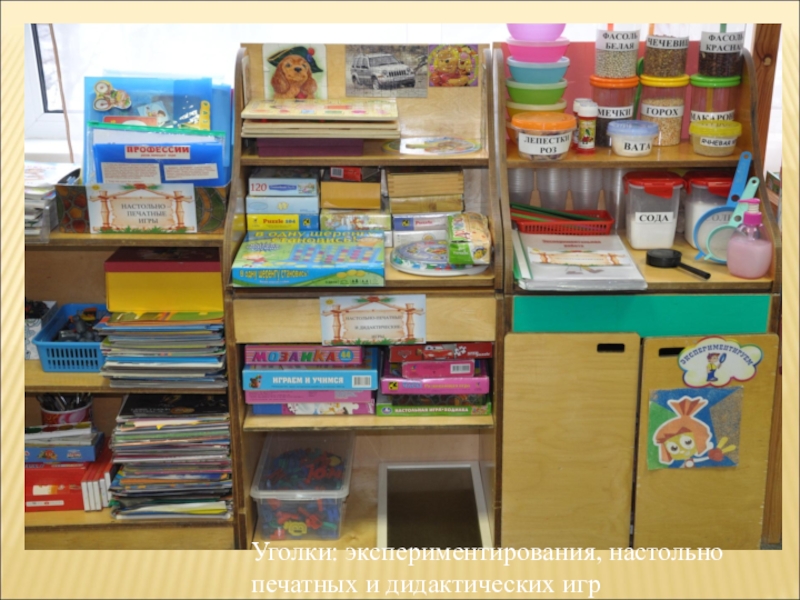 Слайд 20Уголки: экспериментирования, настольно печатных и дидактических игр