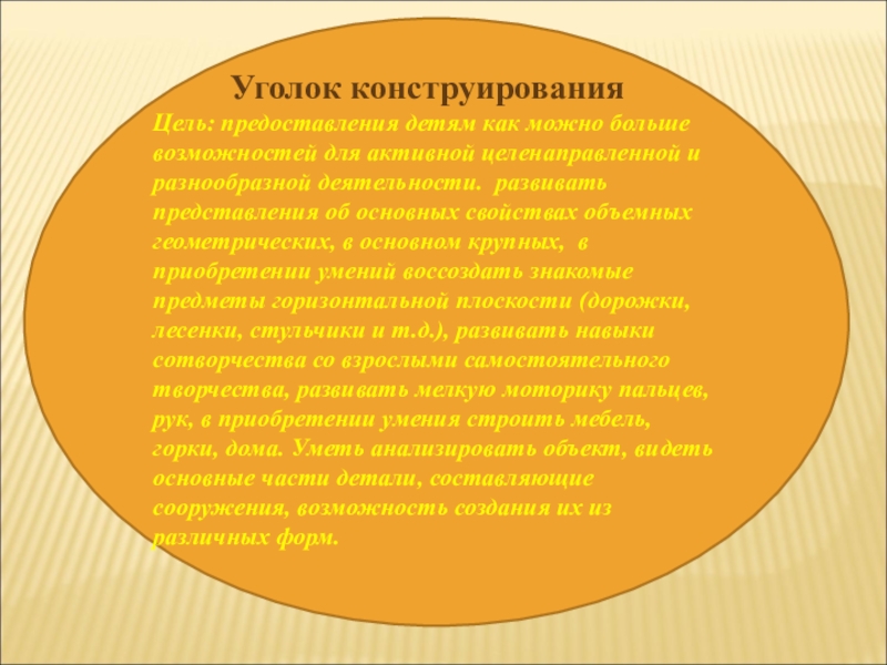 больше возможностей для активной целенаправленной и разнообразной деятельности. развивать представления об основных свойствах объемных геометрических, в основном крупных, в приобретении умений воссоздать знакомые предметы горизонтальной плоскости (дорожки, лесенки, стульчики и т.д.), развивать навыки сотворчества со взрослыми самостоятельного творчества, развивать мелкую моторику пальцев, рук, в приобретении умения строить мебель, горки, дома. Уметь анализировать объект, видеть основные части детали, составляющие сооружения, возможность создания их из различных форм.