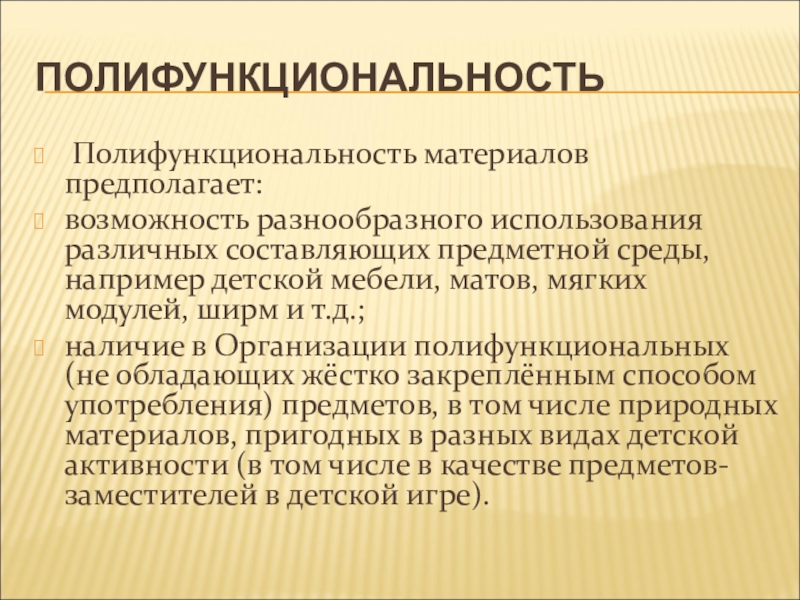 наличие в Организации полифункциональных (не обладающих жёстко закреплённым способом употребления) предметов, в том числе природных материалов, пригодных в разных видах детской активности (в том числе в качестве предметов-заместителей в детской игре).