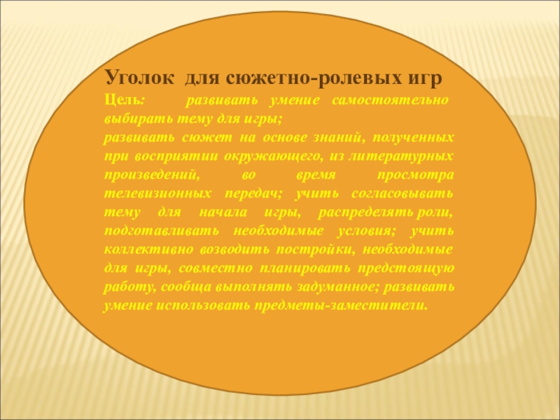 развивать сюжет на основе знаний, полученных при восприятии окружающего, из литературных произведений, во время просмотра телевизионных передач; учить согласовывать тему для начала игры, распределять роли, подготавливать необходимые условия; учить коллективно возводить постройки, необходимые для игры, совместно планировать предстоящую работу, сообща выполнять задуманное; развивать умение использовать предметы-заместители.