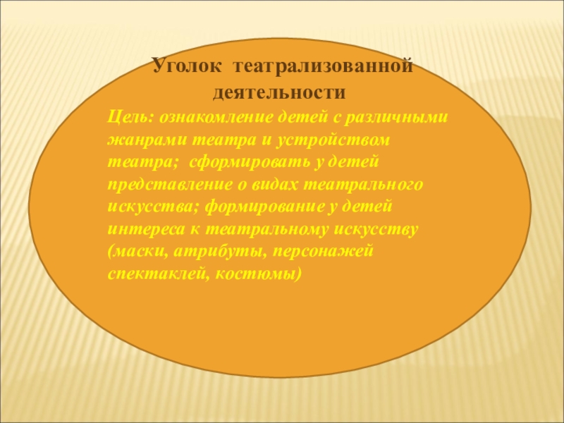 устройством театра; сформировать у детей представление о видах театрального искусства; формирование у детей интереса к театральному искусству (маски, атрибуты, персонажей спектаклей, костюмы)